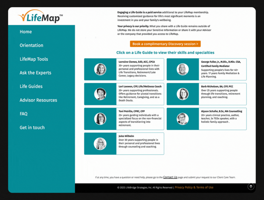 To showcase LifeMap resources, we built an Intelligent Resource Library by enhancing Kajabi course products with a custom Launchpad Marketplace theme, purpose-built to surpass standard platform limitations. The library features a left sidebar and Netflix-style card layout for instant loading, quick search, and an intuitive interface, making it easy for both advisor teams and clients to find what they need.